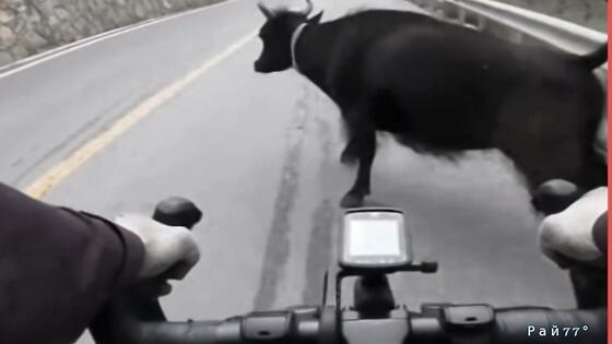 Любитель острых ощущений, прокладывающий свой путь на велосипеде, неожиданно оказался на пути у парнокопытной участницы дорожного движения.