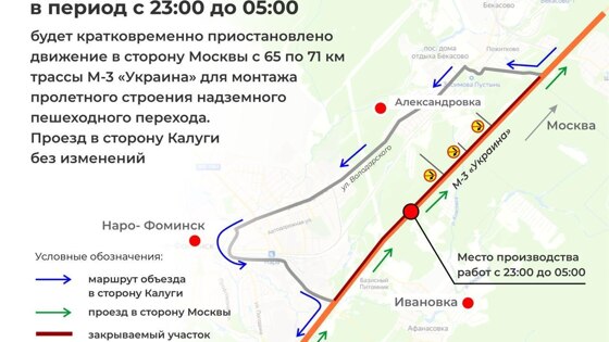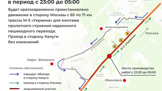 В ночь на 22 августа 2025 года на 70-м километре трассы М3 «Украина» дорожники будут монтировать конструкции надземного пешеходного перехода. В связи с этим участок с 65-го по 71-й километр будет перекрыт. Как сообщили в ГК «Автодор», ограничения для транспорта будут действовать с 23:00 до 5:00. Автомобили все это время будут отправлять в объезд — через Александровку, а также по Московской улице и улице Володарского в Наро-Фоминске.
