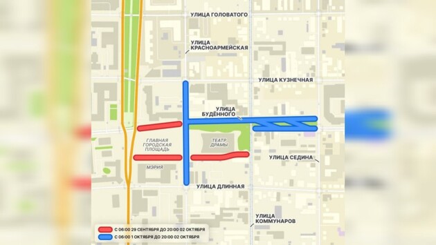 Проезд в самом центре Краснодара ограничат на четыре дня. С шести утра 29 сентября до восьми вечера 2 октября автомобилистам будет недоступен участок улицы Буденного: от Красноармейской до Красной, а также территория перед зданием мэрии и вблизи театра драмы.