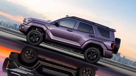 Впереди — решётка с двумя хромированными перекладинами и многоугольные фары, бампер получил более прямые линии. По бокам оставили декоративные «заклёпки» на арках, добавили новый оттенок кузова “Dunhuang Purple”. Сзади по-прежнему висит запаска, но убран защитный кожух, а эмблемы и надписи освежены.
