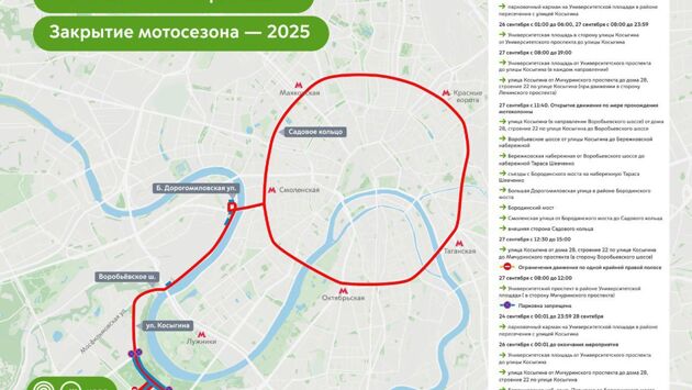 27, 28 и 29 сентября на ряде улиц в столице перекроют движение. Это связано с проведением Московского мотофестиваля, посвященного закрытию сезона, а также Московского детского велофестиваля.