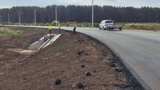На участке подрядчик выполнил предварительное выравнивание основания. Дорожники уложили двухслойное покрытие из асфальтобетонной смеси. На некоторых участках ее уже сделали в бетонном исполнении, установили прикромочные лотки, отремонтировали водопропускные трубы большого диаметра.