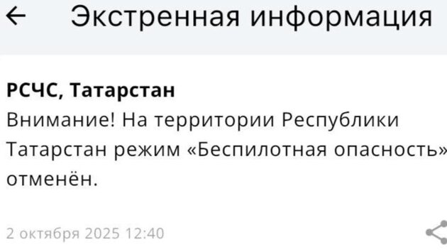В Татарстане отменили режим "Беспилотная опасность". Об этом сообщили в приложении МЧС.