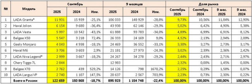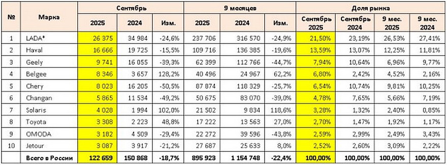 Авторынок РФ в сентябре: в рейтинг снова вошла Toyota, а у кроссоверов Belgee – рост продаж