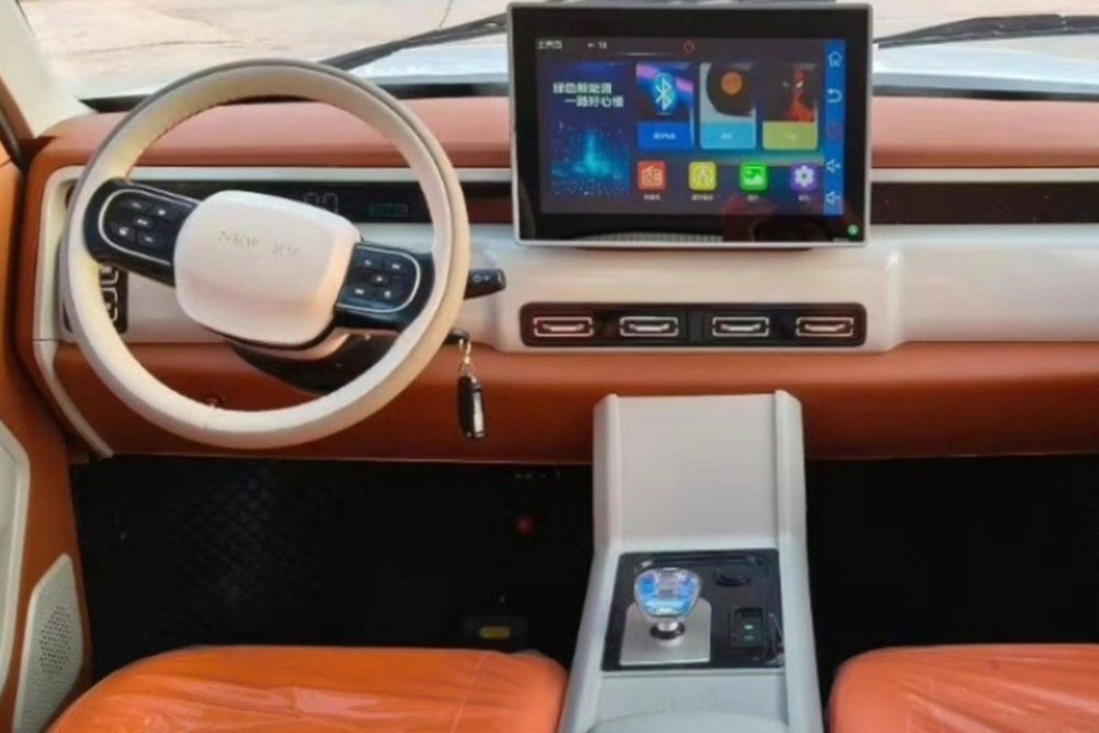 Интерьер выполнен с оглядкой на оригинальный 9X: в салоне установлена "парящая" мультимедиа, но с широкой рамкой и минимальным функционалом. Из оснащения - простая аудиосистема, Bluetooth и физический ключ зажигания.