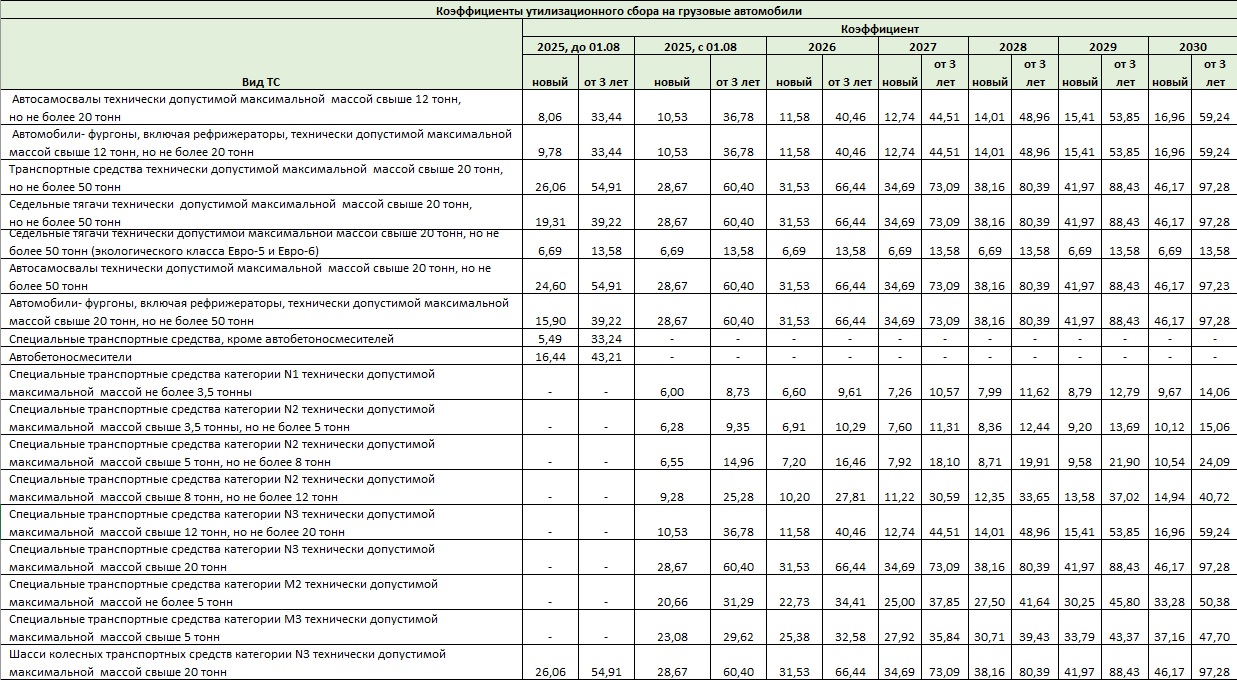 Специальные транспортные средства категорий N1, N2, N3, M2, M3 с различной допустимой максимальной массой получили индивидуальные коэффициенты.
