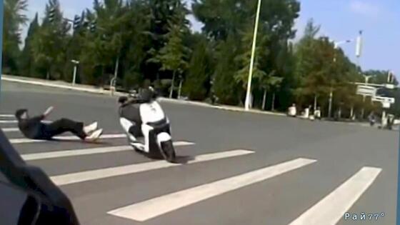 Молодой человек, пересекая оживлённую автомагистраль в Поднебесной, упустил свой скутер, который прервал съёмочный процесс и опрокинул мотоциклиста.