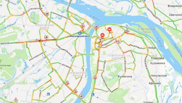 Наиболее сложная ситуация наблюдается в центре города. Движение затруднено на улицах Родионова, Белинского, Ильинской, Горького, Октябрьской, Тимирязева, Варварской.