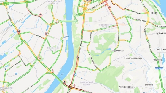 Также движение затруднено в центре города на площади Минина и Пожарского, улицах Белинского, Пискунова, Горького, Большой Печерской, Казанском и Зеленском съездах, Нижневолжской набережной у Канавинского моста.
