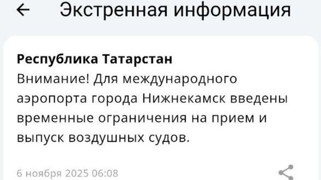 Кроме того, в аэропорту Нижнекамска (Бегишево) в 06:08 ввели временные ограничения на прием и выпуск воздушных судов.