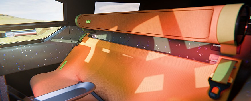 Салон Fiat Dolce Camper выглядит даже более футуристично, чем экстерьер. Первый ряд составляют два отдельных кресла, второй – «сплошной» диван. Кресла снабдили цилиндрическими подголовниками, при этом сбоку у них расположен полупрозначный корпус для ремней безопасности. Интерьер отделан в ярко-оранжевом цвете с элементами «под камень» и «под дерево». По центру овального «глухого» руля находится панель для управления трансмиссией. На столике перед передним пассажиром имеется устройство для беспроводной зарядки смартфонов.