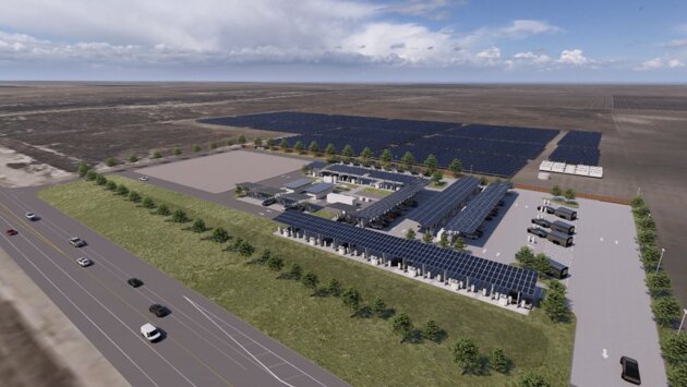 Эта станция работает полностью на солнечной энергии и не зависит от традиционной электросети. Для поддержки транспортных средств с прицепами Tesla использует мегапакеты и системы солнечных навесов. Весь строительный проект был завершён в «удивительно короткие сроки» для такого масштаба — менее чем за восемь месяцев.