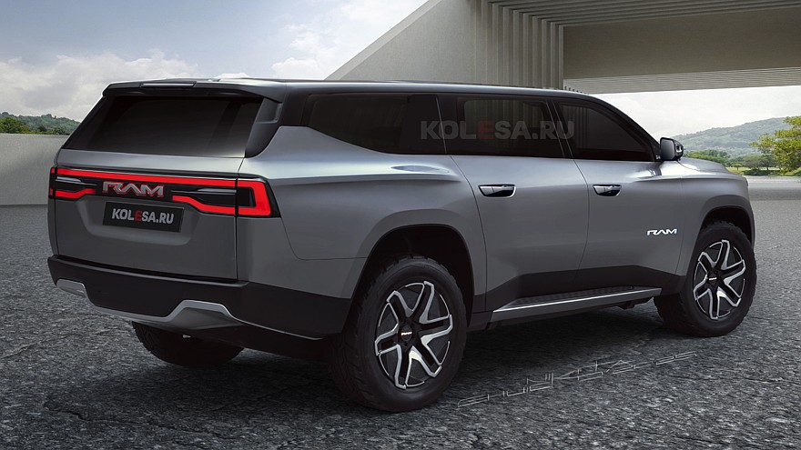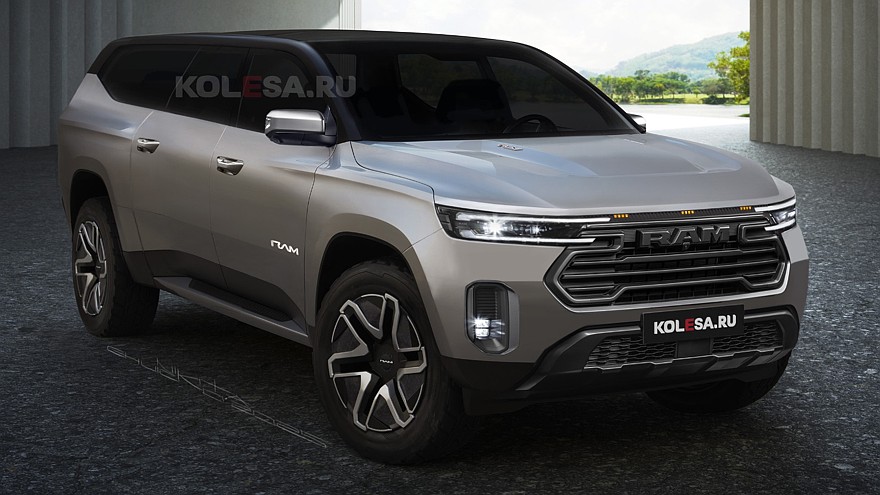 Информации о его внешнем виде и габаритах пока нет, можем предположить, что это будет полноразмерный внедорожник, сделанный на базе пикапа Ram 1500.Основным ориентиром при создании рендеров стал единственный за последнее время концепт бренда, демонстрирующий новое направление в дизайне — Ram 1500 Revolution BEV, представленный в 2023 году. У него позаимствовано характерное остекление с чёрной крышей, пластика боковин, общая стилистика оформления задней оптики. Передняя часть при этом сделана более традиционной и получила трапециевидную решётку радиатора в паре с относительно узкими горизонтальными фарами. Внедорожник обладает достаточно длинной колёсной базой, что делает его потенциальным конкурентом таким моделям, как Chevrolet Suburban, Ford Expedition Max и родственному Jeep Grand Wagoneer. Фонари получили оригинальную форму и широкую светодиодную полосу между ними, что является отсылкой к ещё одной родственной модели — кроссоверу Dodge Durango.