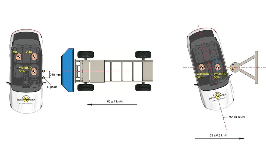 Два прежних боковых краш-теста сохранены, а именно удар о деформируемый барьер на скорости 60 км/ч и удар о столб на скорости 32 км/ч, но они будут дополнены виртуальными краш-тестами. При ударе о деформируемый барьер за рулём сидит мужчина пятидесятого перцентиля, на заднем сиденье — дети 6- и 10-летнего возраста. При ударе о столб за рулём сидит мужчина пятидесятого перцентиля, на месте переднего пассажира — он же, то есть идентичный манекен, но откинувший спинку кресла немного назад для более удобной посадки. Разница в посадке может снизить эффективность центральной подушки безопасности, защищающей водителя и переднего пассажиров от ударов друг о друга. Нагрузки при отскоке и опасные изгибы тела по-прежнему измеряются в полном объёме.