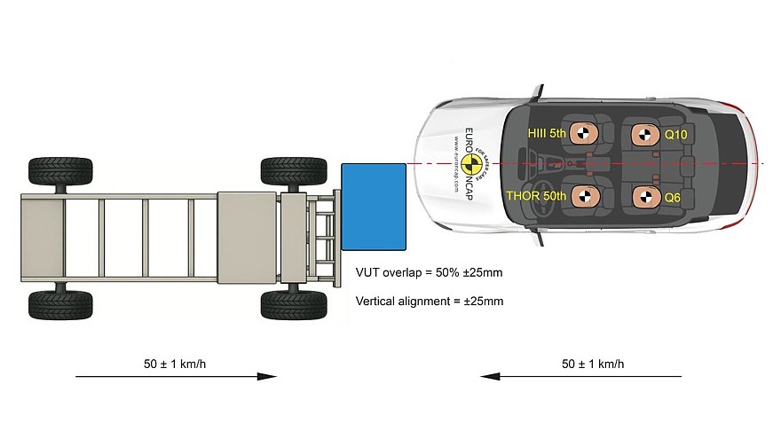 Схема краш-теста, имитирующего выезд на встречную полосу, прежняя: фронтальный удар с 50-процентным перекрытием о движущуюся навстречу тележку с прикреплённым к ней деформируемым барьером. Скорость движения тележки — 50 км/ч. Скорость движения автомобиля — 50 км/ч. Барьер имеет прогрессивную жёсткость: чем сильнее автомобиль его сминает, тем сильнее сопротивление. Масса тележки с барьером — 1400 кг.