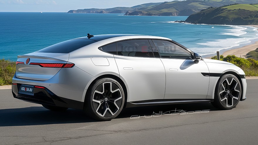 Основой для новинки послужит одна из самых ярких моделей прошлого года — лифтбек Xpeng P7 второго поколения, премьера которого состоялась прошедшим летом. Volkswagen получит схожие пропорции с длинным капотом и достаточно большой колёсной базой, а также схожую форму остекления со «скрытыми» передними стойками. При этом дизайн передней части здесь совершенно иной: вытянутые почти во всю ширину блоки ходовых огней практически идентичны таковым на ещё одной грядущей новинке — кроссовере Volkswagen ID.Unyx 08. Блоки основного света встроены в бампер и визуально объединены с контрастными вставками на боковинах. Сзади схожие по форме с передними габаритами фонари, а ниша номерного знака встроена в бампер.