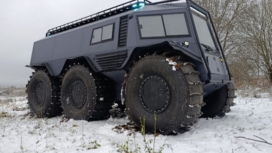 Генератор для выработки энергии для двигателя создан на базе 40-ваттного дизеля Kubota V-2403. Габариты 6-колесного вездехода: 5670 × 2500 × 2890 мм. Автомобиль уже доступен к заказу по цене от 16,5 млн рублей.