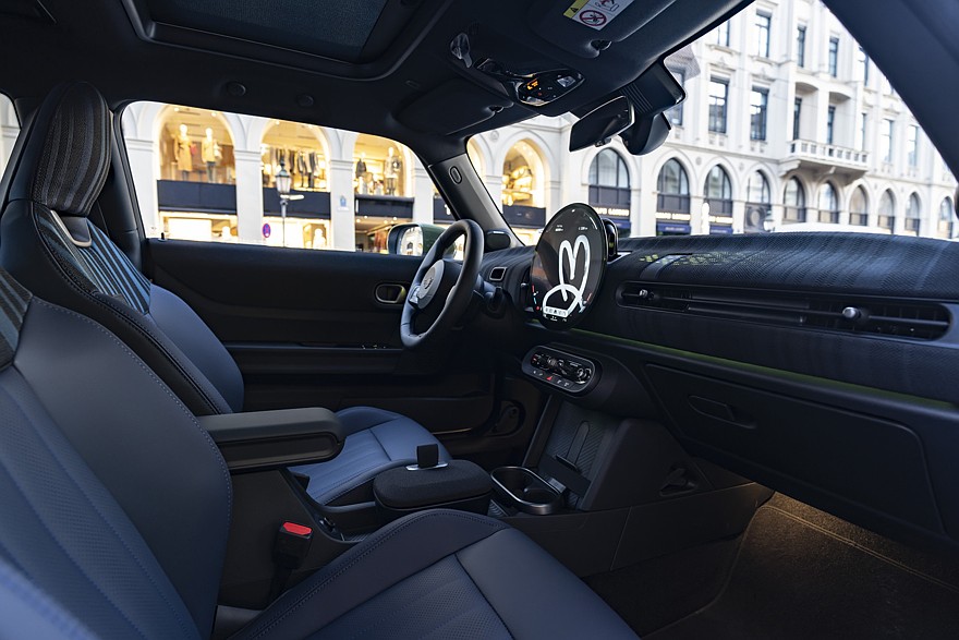 Передняя панель тоже отделана тканью и имеет вставку в виде узкой полоски, которая проводит через всю ширину панели и оформлена в цвете Nottingham Green. На дверном пороге можно увидеть девиз Пола Смита, который можно перевести как «Каждый день – это новое начало». А коврики в салоне украшены изображением стилизованного кролика, которого модельер нарисовал от руки.