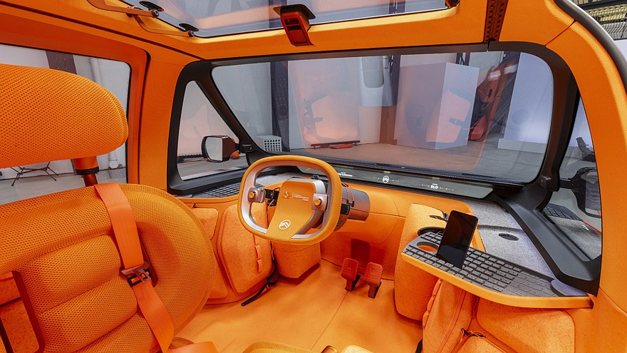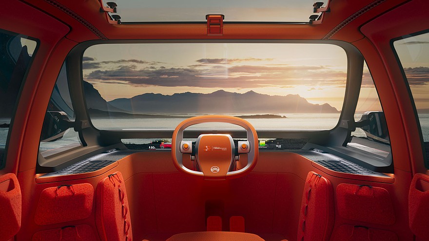 В ярко-оранжевом салоне Citroen Elo место водителя сдвинуто максимально вперёд и размещено по центру. Нижняя секция лобового стекла представляет собой большой горизонтально вытянутый проекционный щиток приборов. Руль с физическими кнопками по форме ближе к овалу. Кресло водителя во время стоянки можно развернуть лицом к пассажирам, сидящим позади, предусмотрен и обеденный столик. В багажнике имеется два надувных матраса от Decathlon, с их помощью можно организовать полноценные спальные места в салоне.