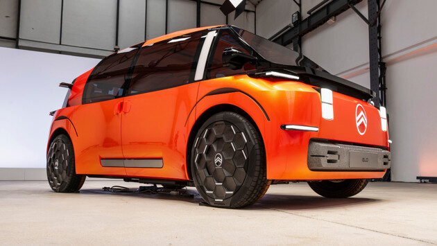 Концепт получил светодиодные горизонтальные штрихи ходовых огней, четыре квадрата в роли основных блоков фар, светящийся овал актуального логотипа. Ещё концепт может похвастаться солидной площадью остекления – 4,5 кв. метра. У Citroen Elo нет центральных стоек, что делает более удобной посадку и высадку пассажиров. Также шоу-кар снабдили комплектом шин с оранжевым подтоном, которые специально для него разработала компания Goodyear. Их дополнили светодиодными индикаторами давления на ступицах колёс.