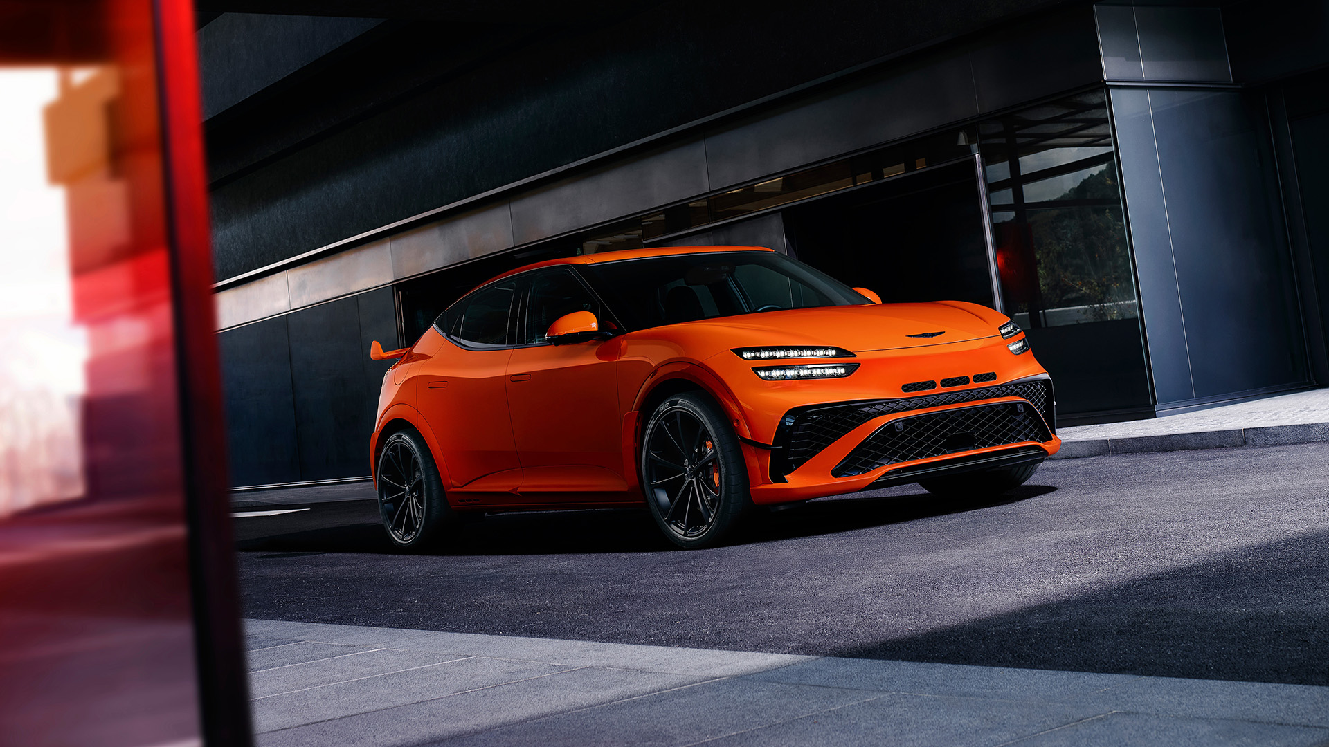 Первой серийной моделью суббренда Magma для «заряженных» автомобилей Genesis станет купе-кроссовер GV60. Машина в фирменном ярко-оранжевом оттенке получила новый аэродинамический обвес с чёрными элементами и 21-дюймовые колёса. В интерьере появились спортивные кресла, новый руль и отделка чёрной кожей и алькантарой с оранжевыми акцентами.