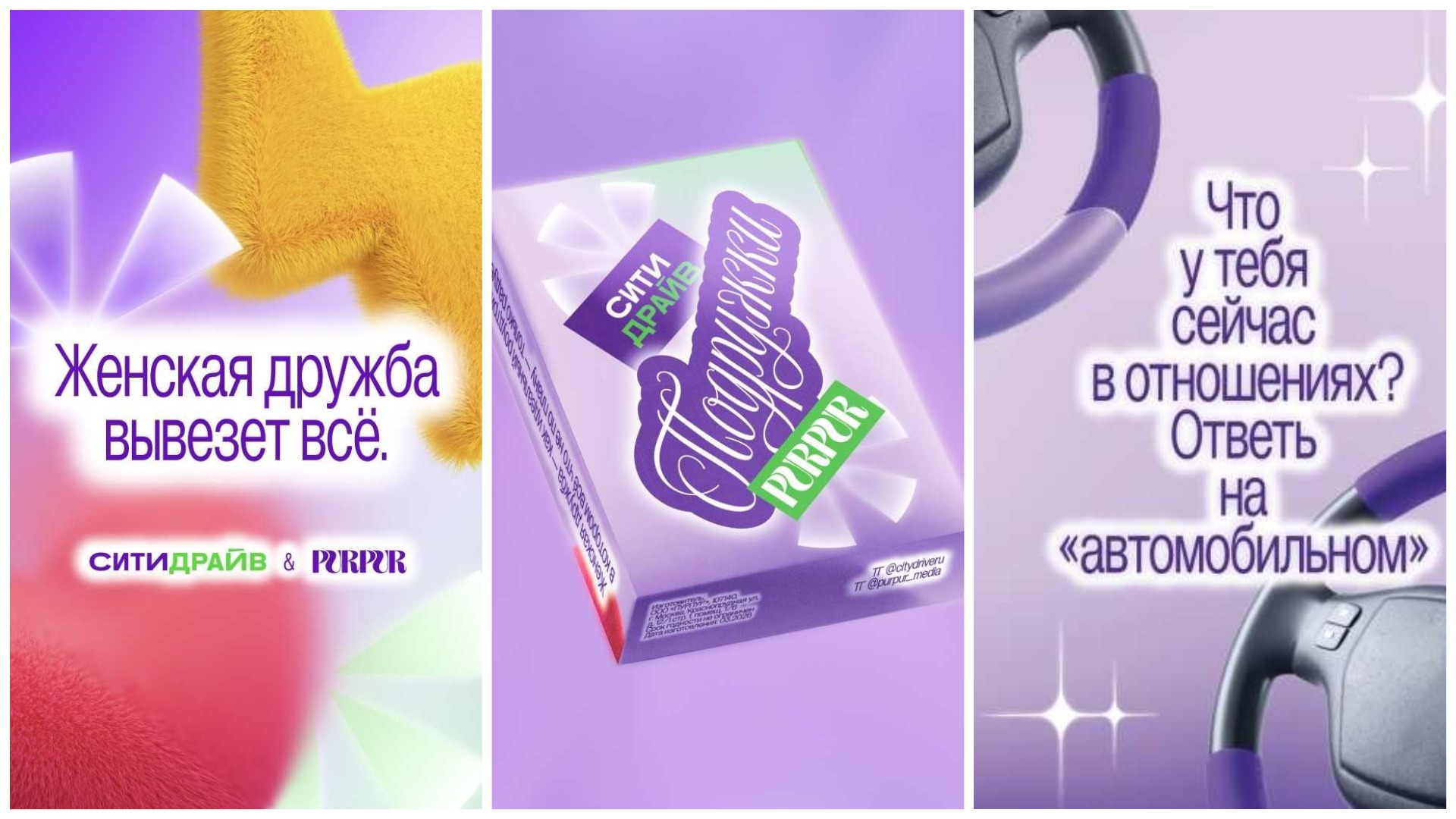 В рамках проекта Ситидрайв и Пурпур провели опрос среди 500 своих сотрудниц и пользовательниц с целью узнать их взгляд на роль женщины в современном мире. Они обсудили баланс карьеры, личных достижений и важность искренней дружбы. Согласно полученной статистике, 42% женщин стремятся сочетать уверенность и эмоциональность, для 28% важно оставаться верной себе. Ещё 13% важно совмещать успешную карьеру и домашний уют.