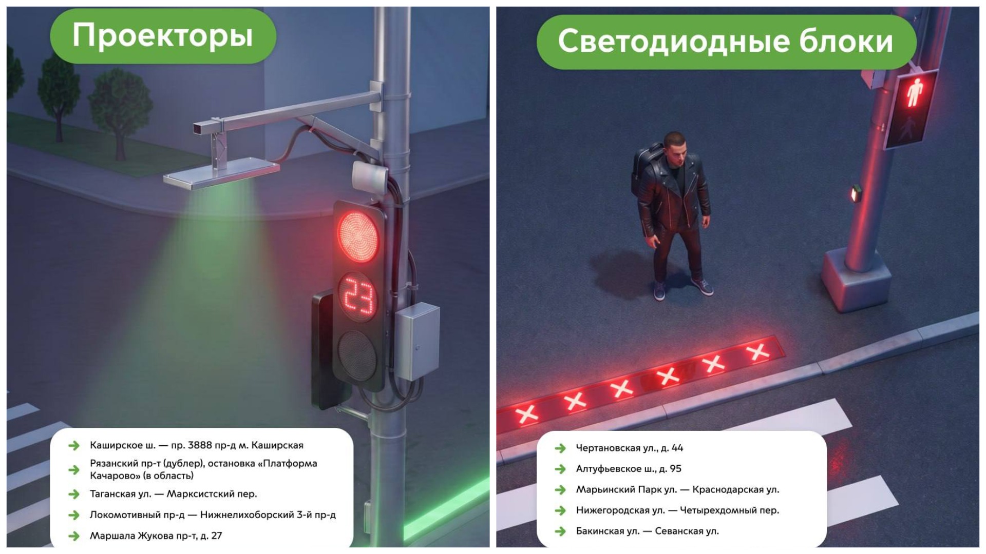 Тест пройдёт по десяти адресам: на пяти из них будут тестироваться встроенные в тротуар светодиодные блоки, а на остальных пяти — световые проекторы, который также передают сигнал на асфальт, но без светодиодной полосы.