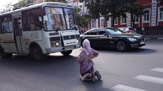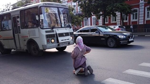 Попрошайка, стоя на коленях, блокирует движение в Орле