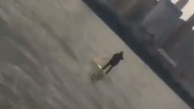 Американец в деловом костюме пересек реку на доске, чтобы успеть на встречу