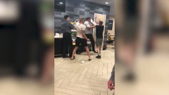 Менеджер попросил удалиться из заведения пьяных молодых ребят после того, как они заперли сотрудника McDonalds в шкафу и били по его кепке, но это им определенно не понравилось Этот инцидент произошел в Великобритании. На кадрах видно, как перед менеджером заведения стоят двое подростков, а один из них начинает толкать сотрудника McDonalds и сильно бить его по лицу. Второй подросток же держит мужчину, чтобы он не вырвался. Мать советует сыну остерегаться идиотов на дороге и сама врезается в него – видео>> Сам менеджер же не бьет парней в ответ и лишь старается увернуться от каждого замаха и держать подростков на расстоянии, но драка набирает обороты, и они не хотят прекращать. Удивительно то, что никто не вмешивается в происходящее, и многие даже смеются. В какой-то момент, мужчину даже валят на землю, а глухие звуки от ударов слышны по всему залу. И лишь спустя почти минуту одна из женщины кричит: "Хоть кто-нибудь может помочь? Пожалуйста!". После этого подростки прекращают бить мужчину и уходят восвояси.
