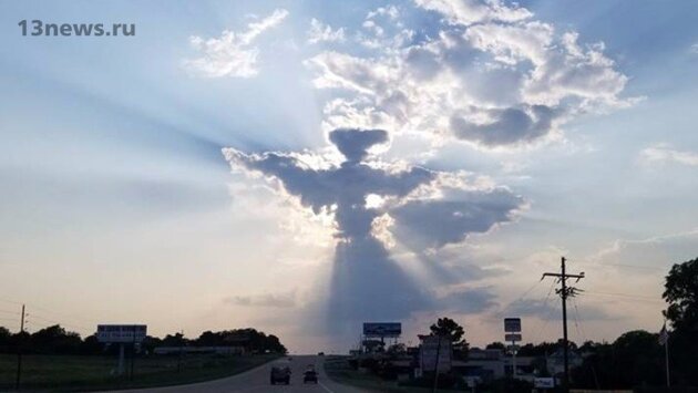 Некоторые природные явления способны удивить очень сильно, а некоторых и поверить в существование высших сил, которые могут оставлять подобные знаки в небе. Недавно в небе над американским штатом Техас появился вполне безобидный символ в виде ангела из облаков. Однако, не все люди его восприняли как нечто доброе и светлое и большинство решило, что знак является дурным и не предвещает ничего хорошего. Странном совпадением является то, что ангела из облаков сфотографировал мужчина на шоссе, на котором до этого произошла сильная авария и погибли люди. Быть может таинственное явление предупреждало людей о грядущих негативных событиях? Но не все поверили в том, что символ является мистическим и созданным специально кем-то. Некоторые отнеслись к феномену так, как будто это обычные облака, просто принявшие причудливую форму.