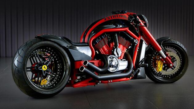 Эксклюзивный красно-черный с вкраплениями жёлтого мотоцикл создали специалисты-кастомайзеры из Германии, из бюро No Limit Custom. Лучше всего он смотрится вместе с цветами гоночного авто марки Ferrari, под который он и был, образно говоря, заточен. Аппарат выполнен на базе Harley-Davidson V-Rod 2014 года выпуска. Он получил название Estremo. При этом от изначального V-Rod от американской фирмы мало что осталось. Здесь кастомная выхлопная система - от No Limit (типа 2-в-2, черного цвета), кастомный головной свет тоже от No Limit, кастомные задний обтекатель, крышка радиатора, крышка воздухозаборника,маятник, вилка, крышка мотора, ручки, рычаги, указатели поворота, тормозные суппорты, сиденье и, конечно, окрас. Почти все - от No Limit. Гигантские шины - от Metzeler, модели Marathon размера 280/35 R18. Впечатляет? Безусловно. Сколько времени у создателей ушло на такую переделку, не уточняется. Но выглядит получившийся у них результат - без преувеличения, как произведение искусства. Мотоциклостроительного искусства. Ателье No Limit Custom Manufaktur расположено в городе Хюффенхардт в земле Баден-Вюртемберг и работает уже больше двадцати лет. Компания специализируется на кастомах, основой для которых служит техника легендарной американской марки Harley-Davidson. Приобретение таких редких мотоциклов может заодно стать и неплохим вариантом вложения средств - ведь подобные уникальные творения от авторитетных мастеров со временем не дешевеют, а только дорожают. Свидетельство чему - достойные суммы, которые удается выручить при продаже владельцами подобной техники, например, на зарубежных аукционах - том же Bonhams, например. Кстати, мотоцикл NLC Estremo, представленный на фото - продаётся. Мотоцикл растаможен и находится в Москве. Никогда не стоял на учёте. Пробег байка по одометру всего 086 км! Стоимость кастомбайка 4 600 000 рублей.