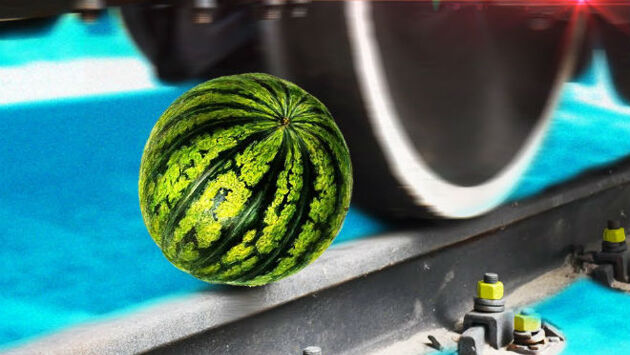 Экспериментатор с ютуб-канала отправился на железную дорогу и показал, что будет, если положить перед поездом арбуз и несколько других предметов. Все происходящее сняли в слоу-мо. Для начала блоггеры попробовали положить под поезд монеты и банки содовой. Результат предсказуем: монета превратилась в симпатичный стальной диск, банки же просто разорвало многотонной махиной поезда. И напоследок на рельсы отправился арбуз. В слоу-мо встреча стальных колес и арбуза выглядит впечатляюще. Считаем своим долгом предупредить, что повторять подобные эксперименты самостоятельно не стоит. Риск слишком велик, да и развлекаться рядом с железной дорогой просто глупо.