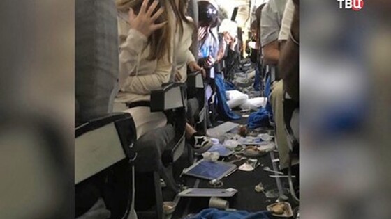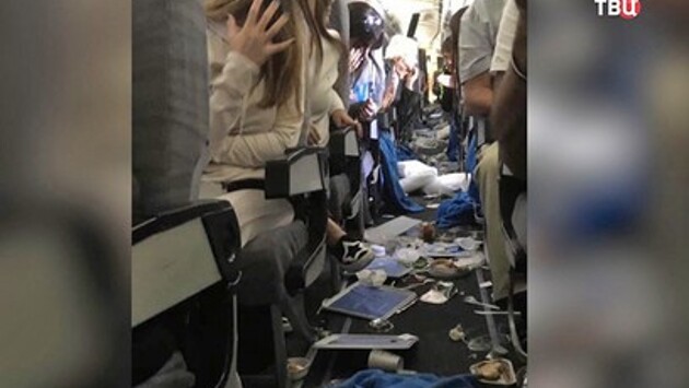 В соцсетях появились ужасающие кадры. В салон выпала часть аварийных кислородных масок, весь пол завален упавшими вещами и продуктами, прямо в проходах лежат люди. В итоге 8 человек были госпитализированы.