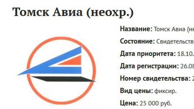 Товарный знак обанкроченной авиакомпании «Томск авиа» оценен всего в 25 тыс. руб. Приобрести его можно на специализированном сайте по продаже подобных активов, сообщает корреспондент Sibnovosti.ru. «Товарный знак зарегистрированный в реестре Роспатента… со сроком действия до 18.10.2020», - говорится в характеристике лота, данной конкурсным управляющим ООО «Авиакомпания «Томск авиа» Николаем Скажутиным. При этом, при отсутствии заявок, цена будет снижаться. В условиях продажи также говорится, что покупателем товарного знака не может быть физическое лицо. Sibnovosti.ru не раз писали о ходе банкротства ООО «Авиакомпания «Томск авиа» (оно было введено в 2016 году) и продажи активов некогда крупного предприятия отрасли. Уж реализованы несколько вертолетов Ми-8, самолетов Ан-24 и Ан-26. С 6 ноября 2018 года будут приниматься заявки на покупку еще семи вертолетов. Фото: www.brandmarket.ru