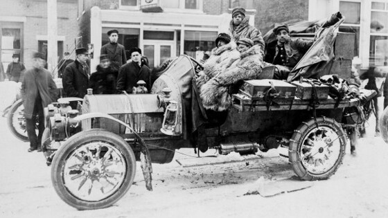 Студеным утром 12 февраля 1908 года четверть миллиона человек высыпали на улицы Нью-Йорка, чтобы своими глазами увидеть старт грандиозного автопробега. Конечным пунктом гонки, начавшейся на Таймс-сквер, был назначен Париж! Шести экипажам — американскому, немецкому, итальянскому и трем французским — предстояло пересечь североамериканский континент, через Берингов пролив въехать в Россию (предполагалось, что вода намертво закована льдами) и далее через Сибирь и Восточную Европу добраться до французской столицы. На эту авантюру решились отъявленные сорвиголовы, о чьих проделках не раз писали газеты. Среди них были люди самых разных сословий — от простого механика из Буффало до представителя знатного немецкого рода. Глава нью-йоркского автоклуба объявил, что экипаж, который первым прибудет в Париж, получит тысячу долларов. Но не деньги влекли храбрецов в опасный путь, а жажда бессмертной славы. Генерал-майор Джордж Макклеллан должен был дать старт гонке выстрелом из пистолета ровно в 11 часов. Он, однако, задерживался, и тогда кто-то, не дожидаясь начальства, пальнул в воздух. Автомобили сорвались с места. Вернее, не сорвались, а просто поехали. У самого мощного из них — американского «Томаса Флайера» — под капотом были 72 лошадиные силы и тяжеленный 9-литровый двигатель. У остальных не было и 40 «лошадей». Стоило кортежу покинуть Нью-Йорк, как дорога в привычном понимании этого слова закончилась. Нагруженные запчастями, топливом и провизией машины продирались через сугробы в час по чайной ложке, то и дело останавливаясь для ремонта. Французский «Сизер-Нордэн» сошел с дистанции, не проехав и 200 километров. Заменить сломавшуюся заднюю ось в походных условиях не представлялось возможным. До Олбани к исходу второго дня гонки добрались лишь три автомобиля. Организаторы были вынуждены умерить свой пыл. О какой Аляске и Чукотке может идти речь, если экипажи не в состоянии за 48 часов выехать за пределы штата? От идеи «Из Нью-Йорка — в Париж без помощи парохода» решено было отказаться. После долгих препирательств сошлись на том, что автомобили продолжат свой путь к Тихому океану, а 5 марта погрузятся на поезд в ближайшем городе, доедут по железной дороге до Сиэтла, и оттуда — пароходом до Владивостока. Эту весть участники автопробега, надо полагать, восприняли с воодушевлением. Лидерство сразу же захватили американцы. Как выяснилось, их «Томас Флайер» был не только самым мощным, но и самым надежным. Пока конкуренты теряли время, ремонтируя одну деталь за другой, Джордж Шустер и Монтегю Роберте продвигались вперед. На территории США они так и не столкнулись ни с одной серьезной поломкой. К тому же местные жители всегда были готовы прийти соотечественникам на помощь, когда «Томас Флайер» с развевающимся звездно-полосатым флагом в очередной раз зарывался в снег. Иностранцам по большей части приходилось справляться с распутицей своими силами. Труднее всего приходилось немцам на 34-сильном «Протосе». При въезде в штат Иллинойс у них сломалась последняя запаска. Каретник изготовил новое колесо за день, но эта задержка оказалась роковой. Повалил такой снег, что экипажу не оставалось ничего другого, кроме как ехать по железной дороге. Продвигаться по ней можно было только ночью, пока не ходили поезда. Ночная гонка по шпалам — серьезное испытание 