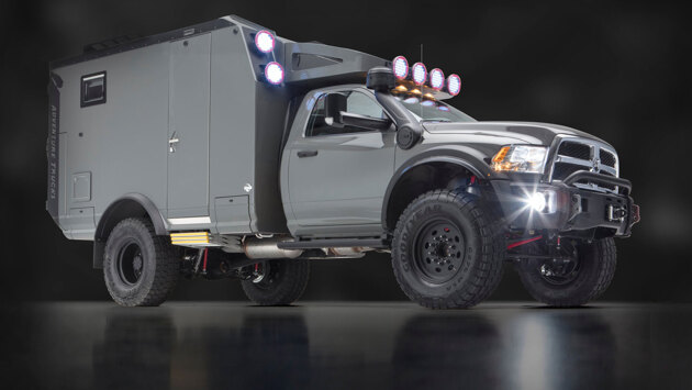 Если бы у вас была возможность взять несколько недель отпуска и отправиться в путешествие по стране, какой автомобиль для этого сразу приходит на ум? Скорее всего, какой-нибудь внедорожник или пикап, который сможет доставить вас, вашего лучшего друга и все необходимое снаряжение в целости и сохранности, при этом вам хватит места и для вещей и для комфортного существования на природе. Однако создавать такой проект с нуля займет немало времени. Сначала нужно выбрать базовый автомобиль, затем оборудовать его всем необходимым для путешествия. Но в Global Expedition Vehicles есть практически готовое решение для искателей приключений - GEV Adventure Truck. То, что получается в итоге - просто космос! Для начала вы можете выбрать между Dodge Ram 5500 или Ford 550. Представляете себе масштабы! Дальше - больше. Вместо кузова на раму устанавливается композитный кунг со спальным местом, кухней, душем и прочими прелестями на двух человек. Кроме того, Adventure Truck оснащен увеличенным бензобаком на 1 000 литров, баком для воды на 300 литров и 100-литровым баком для отходов. Не удивляйтесь таким цифрам - Ram 5500 - это почти ЗИЛ 150 или КамАЗ по грузоподъемности, так что утащить все это хозяйство на себе проблемы не составит, да и необходимости искать ближайший населенный пункт для заправки долго не придется. Причем отличный запас автономии касается не только топлива. На крыше находятся солнечные панели мощностью 400 Вт, что гарантирует беспроблемное снабжение электроэнергией всего, что необходимо. Тем более, что у Adventure Truck по кругу достаточное количество светодиодных прожекторов, чтобы осветить небольшой город. А если вдруг на пути возникнет река, то для ее безопасного пересечения имеется шноркель. Так что GEV Adventure Truck является идеальным транспортным средством для путешествия на любые расстояния. В среднем стоимость такого конструктора составляет 198 000 долларов (около 14 миллионов рублей по нынешнему курсу). Это для очень больших фанатов путешествий.