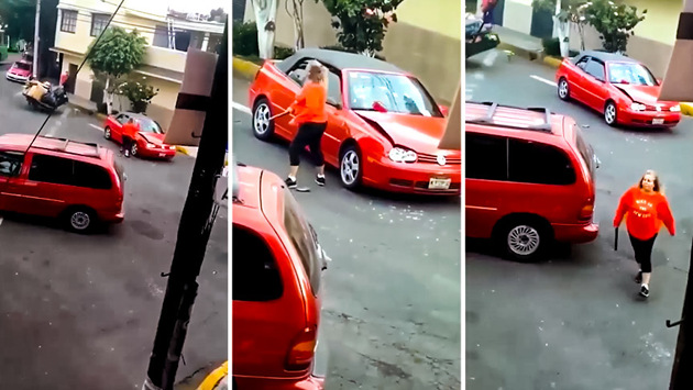 Удивительный случай заснят в солнечном Мехико – женщина, словно разъяренный зверь, превратила Volkswagen в полное непотребство. Вот она – ярость! Пелена упала на глаза пышной мексиканки и поднять этот "занавес" у нее не получилось. Лобовое стекло, фара, капот, зеркало заднего вида… Все это пойдет под замену. Но этого милой даме показалось недостаточно. Она села в свой минивэн Ford Windstar и отрихтовала бок кабриолета. Никто не пытался вмешиваться и пытаться предотвратить избиение кабриолета. Понять окружающих можно – леди немаленькая, агрессивно настроенная, да еще и с обрезком стальной трубы. Причина безудержной ярости? Возможно, она что-то не поделила на дороге с водителем Golf, а, быть может, на кабриолете ездит тот, "на которого она потратила лучшие свои годы". В общем, уехала и слава богу.