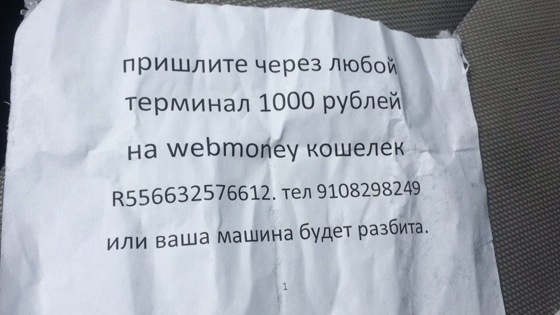 Ярославцы собираются объединиться против угроз Жителям Фрунзенского и Красноперекопского районов Ярославля массово разослали угрозы. Их получили владельцы автомобилей, чьи машины были припаркованы в жилых дворах. Листовки положили под дворники. На бумаге напечатано требование перевести деньги на электронный кошелёк или сотовый номер, иначе машина будет разбита. — Это на улице Кривова. Ещё в другом дворе много оставили таких. Ищем дураков, — написал Андрей Евдокимов, на машине которого оставили послание. — Думаю, это пустые слова, рассчитанные на то, что кто-то поверит и переведёт. Я бы на их месте испугался возвращаться к нашим машинам. Автовладельцы из соседних дворов подтверждают, что подобные листовки - уловка мошенников, с которой они сталкиваются уже не первый год. А некоторые рекомендуют написать заявление в полицию. Указанный номер телефона в листовке - отключен, но зарегистрирован в Ярославской области.