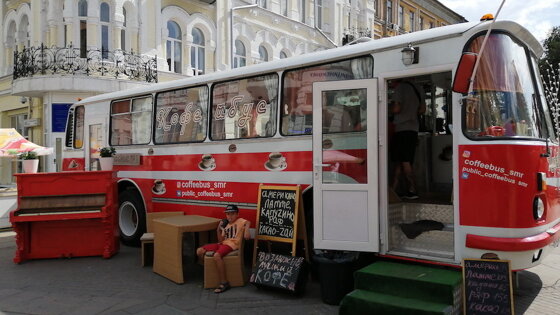 "Кофейбус" - это ярко-красный автобус с кондиционером, барной стойкой, столиками между сидений и витриной со сладостями - кофейня заказывает выпечку у одного из самых известных производителей, делающих пирожные для самарских ресторанов. В будущем Бельский намерен открыть пекарню, чтобы поставлять в кафе булочки уже собственного производства. Интерьер кафе сделан в стиле советских времен - для антуража стоит маленький телевизор с антенной, фильмоскоп, старые часы, фотографии, кассетный магнитофон "Комета". Может быть, поэтому здесь так любят за чашечкой кофе предаться воспоминаниям люди старшего поколения. Возле "кофейбуса" есть фотозона со старым пианино (непременным атрибутом многих советских квартир), покрашенным в цвет автобуса. Вячеслав Бельский рассказывает, что и раньше занимался общепитом, но сделать кафе в автобусе хотел для души. Подобные он видел несколько лет назад во время путешествия по Украине. Автобус купил в Челябинске по объявлению в интернете за 140 тысяч рублей. 300 километров до Самары он проехал с трудом - не обошлось без поломок. Уже дома автобус сделали практически заново - поменяли "начинку", убрали ржавое днище, сделали ремонт в салоне. Теперь уже и не скажешь, что когда-то это была годная только на металлолом развалюха. Всего в свой первый "Кофейбус" Вячеслав вложил 700-800 тысяч рублей. За полгода его фудтрак уже вышел в прибыль. Чтобы окупить вложения, понадобится не меньше года. Надо сказать, в других странах фудтраки могут продавать еду, спокойно разъезжая по городам и останавливаясь в местах с большой проходимостью - на станциях метро, возле офисных центров, концертных залов, учебных заведений, центральных улицах. Они хорошо вписываются в работу городских парков и скверов. Но в России нет закона, регламентирующего мобильную торговлю. Поэтому пока "Кофейбус" стоит в одном месте и выезжает по разрешению властей на городские праздники и гастрономические фестивали. Есть еще один формат работы этого необычного для Самары кафе - для поездок по городу его заказывают экскурсионные группы (в салон помещается не более 19 человек). Кафетерий сотрудничает с одним из самарских туристических агентств. Обычно едут с экскурсоводом от Хлебной площади до сухих фонтанов на Волжском проспекте. "Кофейбус" зарабатывает и на продаже напитков и сладостей, закладывая в стоимость поездки для туристов совсем небольшие траты на бензин. На вопрос, как реагирует Госавтоинспекция на разъезжающий по городу кафетерий, Вячеслав говорит, что техосмотр автобус проходит вовремя, все документы в порядке, поэтому никаких проблем с дорожными инспекторами нет. Бельский уже купил второй автобус (практически металлолом, но на ходу) за 80 тысяч рублей. Пригнал его из Оренбургской области. В нем уже идет внутренняя отделка - на этот раз в молодежном стиле. Где будет стоять "Кофейбус N2", пока непонятно. Но Вячеслав говорит, что власти поддерживают и особых проблем с бизнесом нет. Но не скрывает, что хотелось бы поставить второе кафе на колесах на набережной. А еще в планах охватить всю область: поставить такие же кафетерии в Тольятти, Чапаевске, Новокуйбышевске, Сызрани. Третий автобус Вячеслав уже нашел, теперь думает о покупке. . Между тем На прошлой неделе состоялась первая самостоятельная поездка автобуса по городу от Ленинградской до площади Куй
