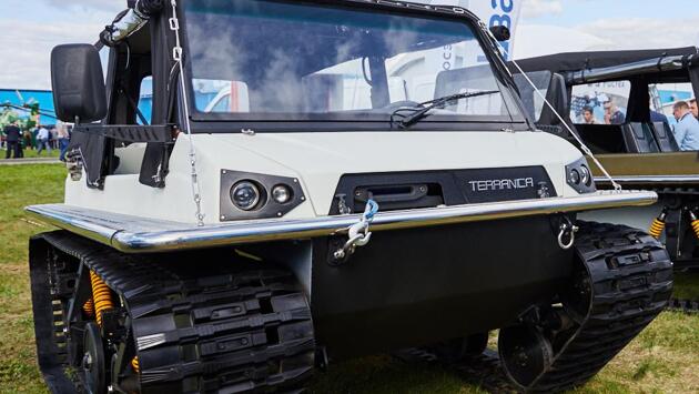 Фото: «Швабе» Холдинг «Швабе» демонстрирует первый вездеход-амфибию с рулевым колесом на Международном авиационно-космическом салоне в Жуковском. Новый гусеничный транспорт перевозит людей по бездорожью и воде на дальние расстояния. Основное преимущество TERRANICA Dreamtrack заключается в наличии автоматической коробки передач – она минимизирует количество возможных застреваний на бездорожье из-за потери крутящего момента. Будучи единственным серийным вездеходом с рулевым колесом, транспортное средство интуитивно понятно и легко в управлении – даже для неопытного водителя. TERRANICA Dreamtrack разгоняется до 80 километров в час и проезжает до 400 километров на одной заправке. Мощный салонный отопитель и предпусковой подогреватель обеспечивают комфортную эксплуатацию при температуре до -50 градусов. Вездеход оснащен мягкой длинноходной подвеской из деталей с низкой истираемостью и высокой ударопрочностью. Это, а также использование новейших разработок в области сверхпрочных полимеров обеспечивает длительный пробег в тяжелых эксплуатационных условиях. Дизельный двигатель с турбонаддувом позволяет развивать большой крутящий момент и мощность до 150 л. с. Двигатель устанавливается в паре с автоматической коробкой передач, что создает непрерывный крутящий момент для уверенного движения по пересеченной местности. «Сейчас разрабатывается план организации сборочного производства – оценка возможностей, подбор помещений, определение основных поставщиков комплектующих и подготовка выставочных образцов. На выставке эту машину представляют впервые, она находится на открытой площадке. Так что все желающие посетители могут оценить вездеход-амфибию вживую», – рассказал заместитель генерального директора «Швабе» Сергей Попов. Представленный на экспозиции автомобиль-амфибия собран на Московском заводе «Сапфир», входящем в холдинг «Швабе». Специалисты предприятия отмечают экспортный потенциал разработки. Сейчас ведутся переговоры с потенциальными дилерами из СНГ и Европы – в частности Австрии, Хорватии и Польши.