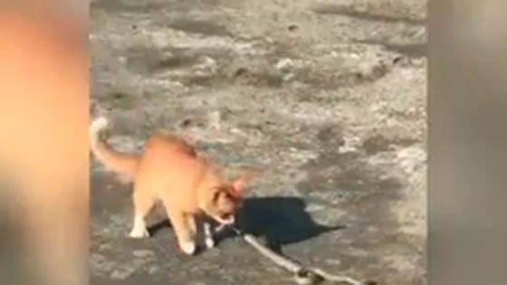 Приморский «Рикки-Тикки-Тави» одержал победу в битве с большой змеей. Очевидцы сняли на видео битву кота со змеей в городе Большой Камень в Приморье. Как пишет портал Prim News, рептилия пыталась атаковать рыжего кота, но усатый смог расправиться с ней, захватив ее немного ниже головы. Пушистый хищник не отступился и одержал победу, после чего унес добычу в зубах. По мнению пользователей, это мог быть ядовитый щитомордник. Однако остальная часть зрителей предположила, что, скорее всего, это безобидный полоз.