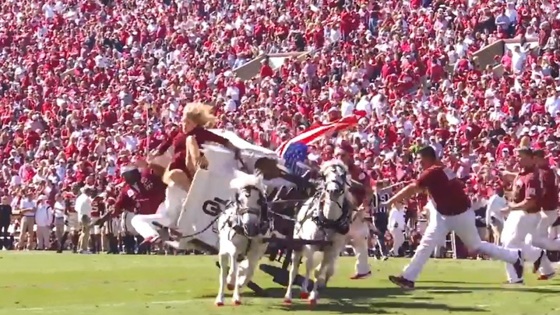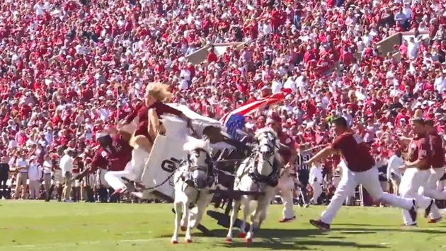 Своеобразное дорожно-транспортное происшествие с участием The Sooner Schooner – повозки, выполняющей роль талисмана спортивных университетских команд из Оклахомы, произошло в минувшую субботу, 19 октября. Фургон, запряженный парой лошадей, бодро вырулил на поле после первой четверти матча против Западной Вирджинии. В какой-то момент возница заложил слишком крутой вираж, и повозка перевернулась, заодно лишившись верхней части. Люди, находившиеся на транспортном средстве, полетели на землю. Известно, что в результате инцидента пострадали три человека, получившие незначительные травмы. Очевидцы поймали и успокоили лошадей и помогли эвакуироваться "экипажу" фургона, после чего очистили поле для того, чтобы спортсмены могли продолжить игру. Примечательно, что крушение маскота не повлияло на моральный дух команды из Оклахомы, в итоге одолевшей соперников. The Sooner Schooner сделан по образу и подобию повозок первых переселенцев, пришедших на территорию современной Оклахомы. Он "трудится" талисманом почти четыре десятка лет – с 1980 года.