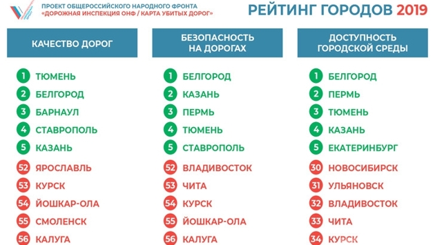 Эту информацию озвучили сегодня в выпуске новостей Первый канал в утреннем выпуске новостей обнародовал итоги работы Дорожной инспекции Общероссийского народного фронта. - Инспекция начала работу 8 апреля в Севастополе, а закончила 13 сентября в Екатеринбурге. За это время контролёры проехали 60 тысяч километров по дорогам федерального, регионального и муниципального значений, - сообщает официальный портал ОНФ. При составлении рейтинга учитывались размеры ям, колеи и разрушение верхнего слоя, выступы люков и решёток канализации, швы и трещины, занижение обочин, а также доступность городской среды. Самые качественные дороги оказались в Тюмени. На втором месте - Белгород, на третьем - Барнаул. Курск на 53 месте. Аутсайдером оказалась Калуга - на 56 (из 56 возможных). Отдельно изучалась безопасность на дорогах (видимость, освещённость, пешеходные переходы и перекрёстки). По этому показателю пальму первенства отдали Белгороду. Второе место в категории «Безопасность» заняла Казань, третье - Пермь. В конце списка разместились Йошкар-Ола (55 место), на 54 - Курск, а на последнем - опять Калуга. Что касается доступности городской среды, то и тут лидером назвали Белгород. Пьедестал почёта с ним разделили Пермь и Тюмень (второе и третье места, соответственно). На последней позиции разместился Курск: проверяющие говорят, что доступной среды в этом городе попросту нет. - Например, трамвайная остановка на перекрёстке улиц Верхняя Луговая и Дзержинского: пассажирам приходится стоять посреди дороги, место не обозначено, не защищено, нет разметки и путей подхода, - рассказали в ОНФ.