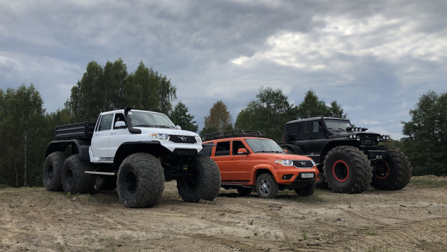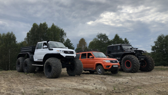 В нашем распоряжении оказались два уникальных вездехода — УАЗ «Ермак» и шестиколесный УАЗ УРСА от компании «Большое колесо». Конечно, мы просто не могли не устроить между ними скоростную дуэль. Тем более, что поблизости нашелся относительно неровный (хотя кого мы хотим обмануть — абсолютно неровный) внедорожный дрэг-стрип. И пусть длина его слегка поменьше классического «квотера», то есть четверти мили, нам было все равно. Третьим в компании внедорожных монстров оказался заводской экспедиционный Патриот...