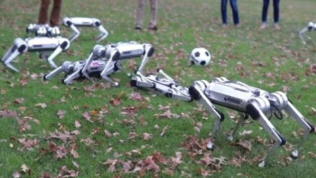 Массачусетский технологический институт (MIT) устроил целое шоу с участием роботов-гепардов (Mini Cheetah robots). Инженеры MIT поделились видео, которое демонстрирует, как эти механические животные бегают, прыгают и даже пинают футбольный мяч. Роботы были спроектированы таким образом, чтобы быть «практически неуязвимыми». Мини-гепарды могут совершать прыжки и приземления, восстанавливаться после небольших повреждений, даже если их сбили с ног. На видео роботы исполняют синхронный танец, где демонстрируют свои гимнастические навыки, а затем все вместе играют в футбол. Каждая из ножек «гепарда» оснащена тремя специально разработанными и недорогими электродвигателями. Их модульная конструкция означает, что каждый из двигателей и других компонентов может быть заменён в случае поломки. Робот весит всего 10 килограмм, развивает скорость до 10 километров в час и может выполнять обратный поворот на 360 градусов из положения стоя. По словам разработчиков, с роботами-гепардами легко экспериментировать, поскольку их конструкция очень надежна. Исследователи собираются презентовать мини-гепарда на Международной конференции по робототехнике и автоматизации в мае. Фото и видео: Biomimetics MIT