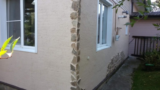 Оnce upon a time… Извините, не удержался. Звучит красиво. В нашей деревне разбирали обшивку дома. Дом свежепостроенный, но хозяйке не понравился материал, которым дом был обшит. Видно, решила, что на природе и дом должен быть из более природного материала. В последствии этот дом обшили блок-хаусом. А первоначальный материал, так называемые вентилируемые стендовые панели, пошли на выброс. Честно говоря, у меня отвисла челюсть от такого широкого жеста. Потому часть панелей до мусорной свалки не добралась. Что они из себя представляют: фанерное основание, на него нанесён слой утеплителя, напоминающего застывшую монтажную пену, на неё приклеена плитка «кабанчик». Устанавливаются на стену дома, как пазлы, только без головоломки. Вентилируемыми называются потому, что крепятся на обрешётку стены дома. Между стеной дома и панелями образуется воздушная прослойка. После окончания монтажа создаётся полное впечатление, что дом сложен из кирпича. Как раз в это время я достроил свой дом из пеноблока и думал, чем отделать фасад. Закончили покраску На лицевую сторону дома хватило абсолютно целой, не повреждённой части панелей. Все сложилось ровно и аккуратно, включая углы. А вот заднюю часть фасада пришлось собирать из того, что осталось. Ломаные панели обрезал лобзиком, плитку резал «болгаркой». Подгонял панель к панели уже как реальные пазлы. Отвалившуюся плитку приклеивал заново. Угол дома пришлось оставить в том состоянии, как на фото. Иначе «пазлов» могло просто не хватить. Ведь разбирали тот дом не особенно церемонясь. Обо мне там не думали. Материал достался мне «на халяву». Да черт с ним, считайте — на помойке подобрал. Так было Швы между панелями заполняются специально предназначенным для этого герметиком. Стоит он тоже недёшево. И если швы между хорошими панелями заполняются без проблем, то между «пазлами» расход реально большой. Заменить на цементный раствор не имеет смысла. Не держится раствор на фанере и монтажной пене. В общем, «я его слепила из того, что было». В итоге встал вопрос: «А что дальше?» Как встал, так и стоял несколько лет. Задняя стена дома в глаза не бросается, так расположен дом, но вот угол… Конечно, можно было бы вставить туда декоративный пластиковый уголок, как в верхней части дома, которая обшита сайдингом, имитирующим блоковую. Но как-то не так. Не завораживает. И вот, once upon a time (Однажды, анг.)… (не, ну как звучит!), пришла идея замазать это все декоративной штукатуркой. Все. Со щелями, поколотой и отклеивающейся плиткой. А замазать потому, что штукатурить я так и не научился. А замазать — пожалуйста! Штукатурка под шуб Плюс декоративной штукатурки в том, что она позволяет даже культурно наляпать. Её секрет кроется в присутствии в составе мелкой крошки. Обычно мраморной или гранитной. Популярных способов (или видов) нанесения покрытия два — «короед» и «шуб». Чтобы сделать под «шуб», необходимо равномерно нанести штукатурку на стену шпателем, а затем погонять по ней поролоновым валиком. Узор зависит от диаметра специальных отверстий в валике. Можно крупнее, можно мельче. Кто что выбирает. Короед в моем исполнении А чтобы получился «короед», надо дать слою штукатурки чуть-чуть подсохнуть, а затем пройтись по ней малярной теркой, слегка на неё надавливая. Мелкие камушки проторят дорожки, как жук короед прогрызает дорожки в древ