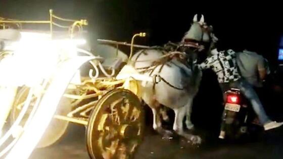 Необычный инцидент с бегством двух лошадей, запряжённых в свадебную карету, на днях произошёл в районе Корегаон парка в городе Пуне (штат Махараштра, Индия). Два копытных беглеца, испугавшись большого скопления людей, убежали с торжественного мероприятия вместе со светящейся каретой. На втором километре экстремального забега двое мотоциклистов решили вмешаться и остановить ретивых путешественников. Подъехав к лошадям поближе, один из молодых людей упал прямо под колёса телеги, но не пострадал и тем самым остановил скакунов. Прибывшие позже полицейские временно арестовали копытных «нарушителей ПДД» и вызвали их хозяев для серьёзного разговора.