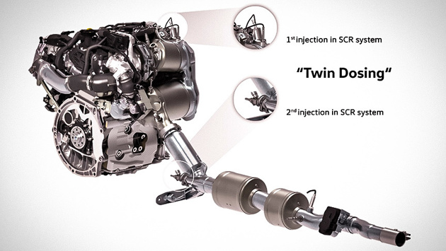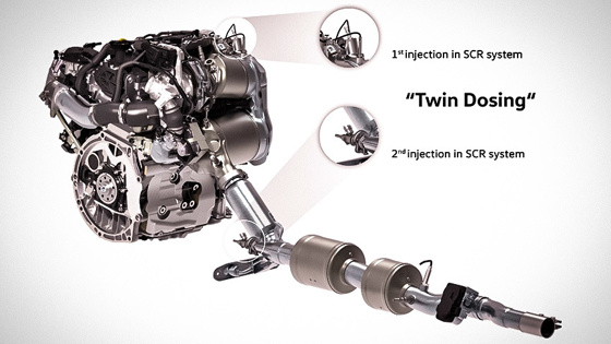 Volkswagen, имеющий колоссальный опыт в дизелестроении, не ставит крест на агрегатах на тяжелом топливе, а очищает их имидж и выхлоп. Так, 2,0-литровый турбодизельный агрегат EA288 Evo, представленный на моторном симпозиуме в Вене еще в 2018 году, стал экологичнее. Дизельгейт радикальным образом повлиял на судьбу двигателей, потребляющих солярку. Одни производители, скрепя сердце, начали отказываться от разработки новых дизелей. Другие пока не спешат вычеркивать их из своей палитры и пускают в ход все возможные способы дабы сделать эти моторы экологичнее. Именно так и получилось в случае с фольксвагеновским EA288 Evo. Вроде бы свежий современный двигатель, появившийся недавно, но нет предела совершенству. Для снижения концентрации оксидов азота (NOx) мотористы применили технологию twin dosing. Процесс двойного дозирования стал возможным благодаря применению «обычного» каталитического нейтрализатора и двойного "очистителя" с селективным каталитическим восстановлением (SCR), который расщепляет оксиды азота, собственно, на азот и пар, являющиеся безвредными компонентами. Каждая очистительная секция оснащена форсункой для впрыска мочевины AdBlue. Преимуществом системы twin dosing является широкий диапазон температуры выхлопа, позволяющий SCR действовать эффективнее, и возможность впрыскивать большие объемы AdBlue.