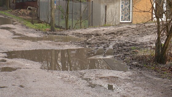 Плюсовой погоде в начале февраля не рады жители улицы Стрелецкой. Любой дождь превращает их дорогу в кашу. Тротуаров нет вовсе. Все, даже некоторые собаки, ходят там в непромокаемой обуви. ЕВГЕНИЯ СОЛОВЬЁВА, КОРРЕСПОНДЕНТ: — Я сейчас иду не по просёлочной дороге в деревне, это Калининград. До центра города всего 10 минут. Но уже 25 лет жителям приходится перемещаться примерно так. Как видно, хорошо тут диким животным. Тротуаров на улице Стрелецкой нет в принципе. Маленьких детей, в прямом смысле, приходится переносить на руках. В радость лужи лишь местной ребятне. По ним они пускают кораблики, и не только. АЛЕКСАНДРА БАЛАНДИНА, ЖИТЕЛЬНИЦА КАЛИНИНГРАДА: — Набираем в пакетики воду и бросаемся ими. Ещё бросаем в забор. Не знаю почему, но это интересно. Папа восторг дочери не разделяет. И периодически засыпает ямы асфальтовой крошкой. Но обустроить тротуар своими силами не в состоянии. ЕВГЕНИЙ БАЛАНДИН, ЖИТЕЛЬ КАЛИНИНГРАДА: — Вот человек идёт, он идёт посреди дороги, там, где ездят машины. Сейчас поедет машина и ему надо уйти куда-то в грязь. Здесь даже собаки ходят в резиновых сапогах. В той же обуви и её хозяин. На прогулку он выходит не редко с лопатой. А вот жители Большой окружной ремонта дороги дождались. Работы здесь организованы с большим размахом, но строители, видимо, забыли, что здесь живут люди, и перерыли дорогу вместе с тротуарами, полностью отрезав доступ к улице от домов. Три дня, говорит Валентина Ивановна, было не выйти. Только сейчас проход засыпали песком. ВАЛЕНТИНА АЛЕНС, ЖИТЕЛЬНИЦА КАЛИНИНГРАДА: — Полностью всё, нигде никуда не выйти, вообще. А мне на уколы надо ездить, машине не подъехать. Возмущаются пешеходы и в районе Орудийной. Теперь жители либо рискуют и идут по дороге, либо вынуждены месить грязь под ногами.